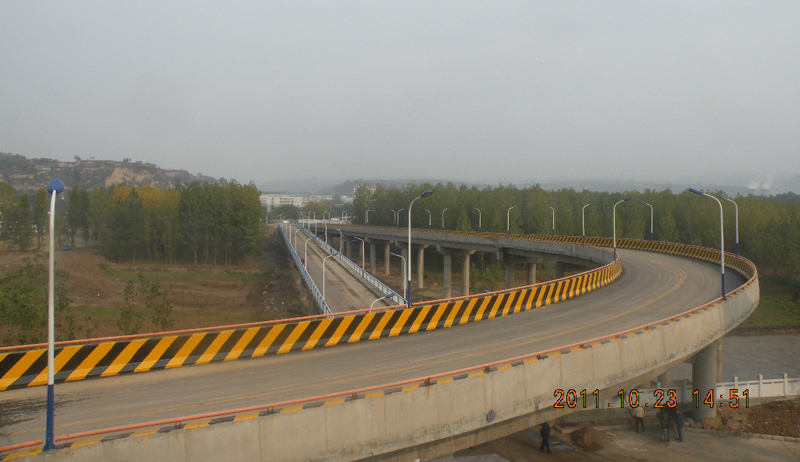 國電霍州發(fā)電廠跨汾河公路大橋東接國道108線(霍侯一級公路),西連電廠運(yùn)煤公路,東接口處南有霍州礦務(wù)局木材加工廠,北有個體汽車修理廠,居民較少。向西跨越汾河進(jìn)入電廠廠區(qū)后要上跨電廠主要出入道路。橋梁分左、右幅:左幅主要承擔(dān)電廠職工的生產(chǎn)、生活用車通行;右幅主要承擔(dān)電廠運(yùn)煤、運(yùn)渣等車輛通行。終點(diǎn)要與國道108線(霍侯一級公路)相連接,接點(diǎn)位置位于國道108線K826+160處。