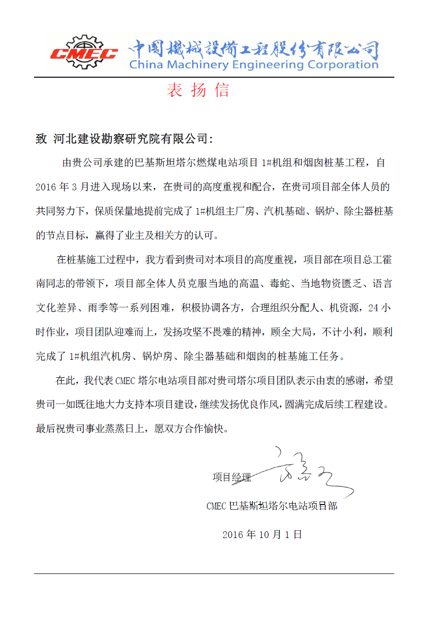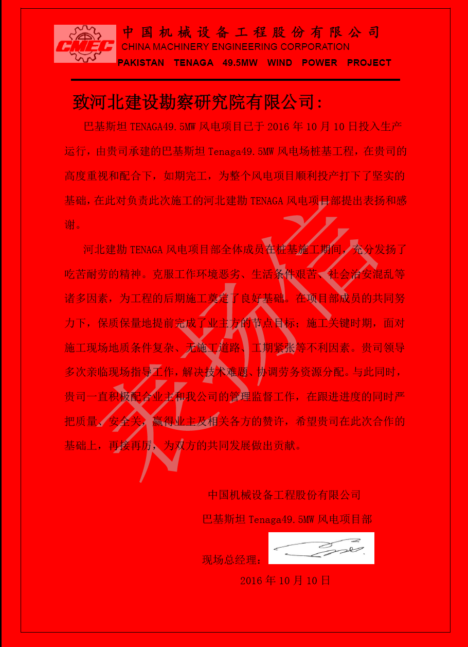 由我公司承建的巴基斯坦塔爾燃煤電站項目1#機組和煙囪樁基工程和巴基斯坦Tenaga49.5MW風電項目,項目部全體人員在項目總工霍南的帶領下,克服工作環(huán)境惡劣、生活條件艱苦等一系列困難,積極協(xié)調各方,合理組織分配資源,順利完成階段施工任務。近日,總包方中國機械設備工程股份有限公司(CMEC)向我公司發(fā)來感謝信,對我公司兩個項目部團隊表示由衷的感謝,并希望我們繼續(xù)發(fā)揚優(yōu)良作風,圓滿完成后續(xù)工程建設。