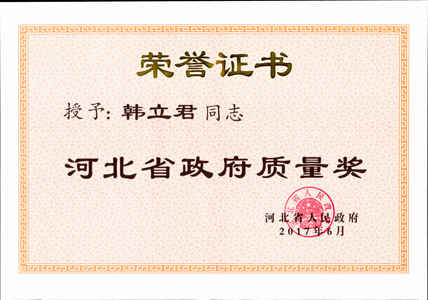 我公司獲得了由河北省人民政府頒發(fā)的“2016年河北省政府質(zhì)量獎”組織提名獎;公司董事長韓立君同志榮獲“河北省政府質(zhì)量獎”個人獎。省委領(lǐng)導為董事長頒發(fā)了獲獎證書和獎杯。