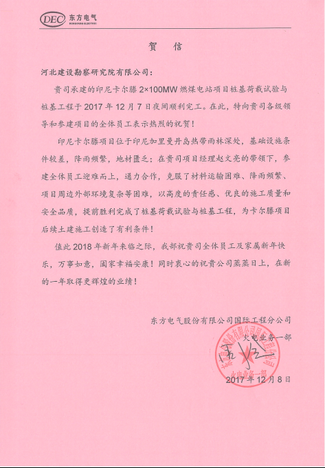 我公司承建的印尼卡爾滕2*100MW燃煤電站項(xiàng)目樁基荷載試驗(yàn)與樁基工程于2017年12月7日夜間順利完工。東方電氣股份有限公司國(guó)際工程分公司發(fā)來賀信,向我公司項(xiàng)目員工表示祝賀。