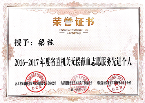 梁棟同志被授予2016-2017年度省直機關(guān)無償獻血志愿服務先進個人