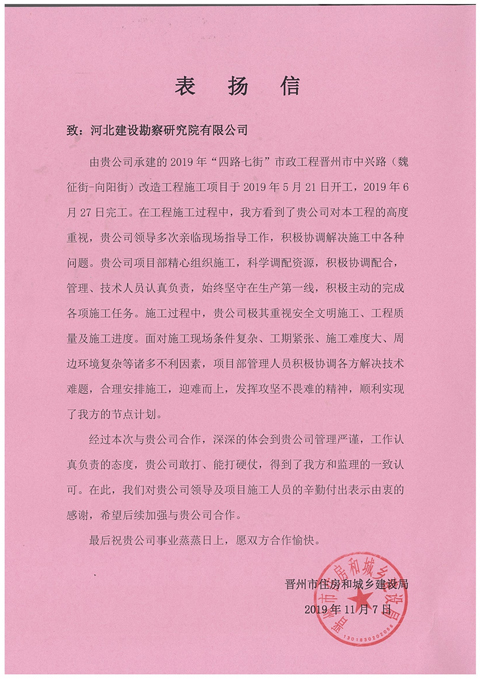 我公司承建的2019年“四路七街”市政工程晉州市中興路(魏征街-向陽街)改造工程,在施工過程中,項目部精心組織策劃,科學調配資源,主動認真負責,始終堅守在生產(chǎn)第一線,確保了工期、質量、安全,順利實現(xiàn)了業(yè)主的節(jié)點計劃,得到了業(yè)主和監(jiān)理的一致認可,為晉州的后續(xù)市場開拓出了新局面。