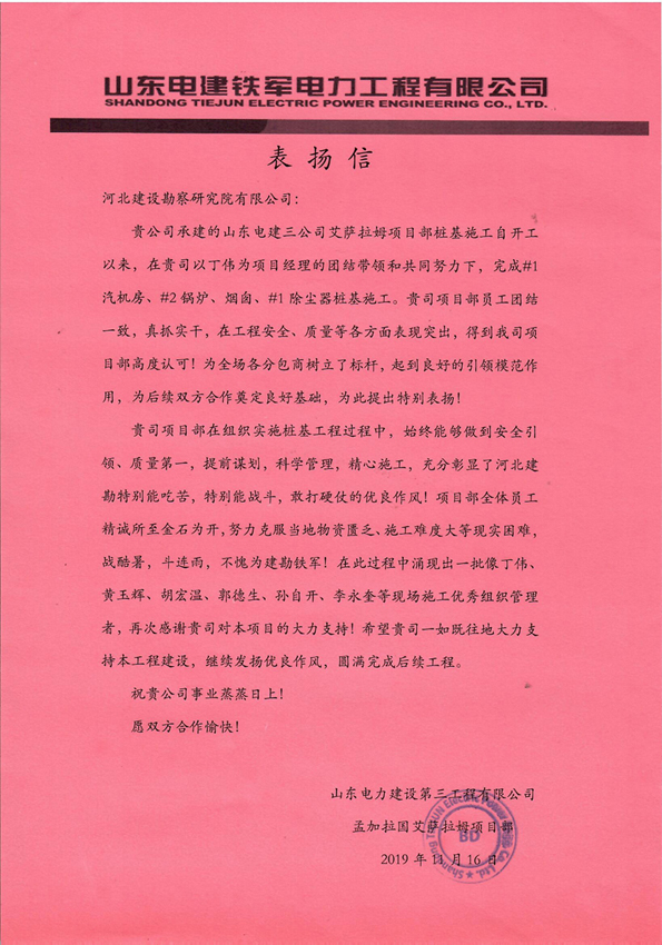 近日,由我公司承建的孟加拉艾薩拉姆項目樁基工程收到總包單位山東電建三公司的表揚信,經(jīng)過項目部全體員工的辛勤付出,得到總包單位的高度認(rèn)可,為后續(xù)雙方合作奠定良好基礎(chǔ)。這充分彰顯了河北建勘人的風(fēng)采,充分體現(xiàn)了河北建勘人的鐵軍精神,充分展示了河北建勘的戰(zhàn)斗力和實力,為我司業(yè)務(wù)在孟加拉更好更快發(fā)展提供了保證。項目部全體員工一定會珍惜榮譽,珍視公司良好發(fā)展平臺,再接再厲,圓滿完成后續(xù)施工任務(wù)!