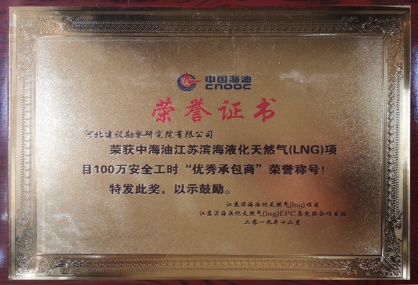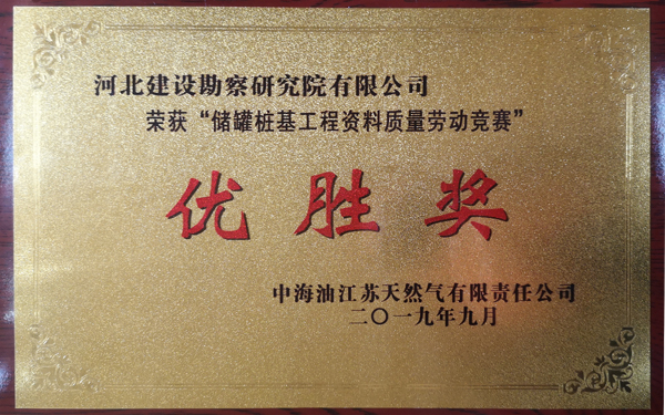 由我公司承建的江蘇液化天然氣(LNG)接收站1#、2#儲罐樁基工程已于2019年09月01日施工完成,2019年12月01日全部檢測完成,樁基檢測結(jié)果全為Ⅰ類樁。在施工期間的質(zhì)量安全管理及我公司項(xiàng)目部的工作作風(fēng)和工作態(tài)度受到了總包、監(jiān)理及業(yè)主單位的充分肯定。在江蘇液化天然氣(LNG)接收站工程項(xiàng)目完工之際,為我公司頒發(fā)了“優(yōu)秀承包商”證書。在建設(shè)單位組織的“儲罐樁基工程資料質(zhì)量勞動競賽”中,通過項(xiàng)目部的努力及公司的全力幫助,獲得優(yōu)勝獎。