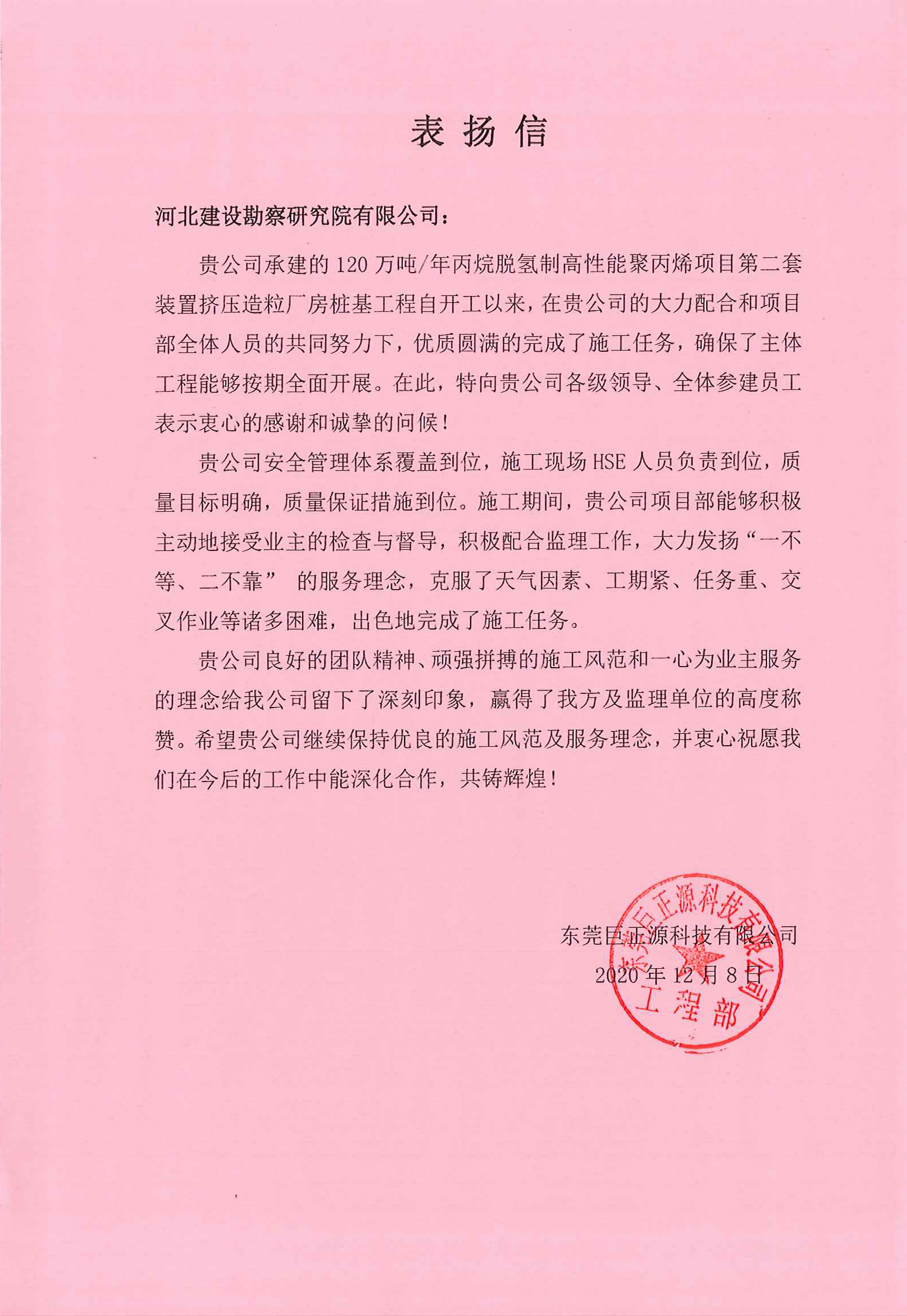 東莞巨正源120萬噸/年丙烷脫氫制高性能聚丙烯項(xiàng)目第二套裝置擠壓造粒廠房樁基工程自開工以來,安全管理體系覆蓋和質(zhì)量保證措施到位,大力發(fā)揚(yáng)“一不等、二不靠”的服務(wù)理念,克服了工期緊、任務(wù)重、交叉作業(yè)等諸多困難,出色地完成了施工任務(wù)。特向公司各級領(lǐng)導(dǎo)、全體參建員工表示衷心的感謝和誠摯的問候!