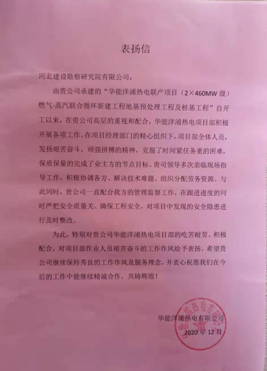 華能洋浦熱電聯(lián)產(chǎn)項(xiàng)目(2×460MW級)燃?xì)?蒸汽聯(lián)合循環(huán)新建工程地基預(yù)處理工程及樁基工程自開工以來,積極開展各項(xiàng)工作,精心組織,克服了時間緊任務(wù)重的困難,保質(zhì)保量完成了節(jié)點(diǎn)目標(biāo)。特對項(xiàng)目部的吃苦耐勞、積極配合,對項(xiàng)目部作業(yè)人員艱苦奮斗的工作作風(fēng)給予表揚(yáng)。