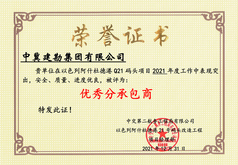 其中,以色列阿什杜德港Q21碼頭項目榮獲“優(yōu)秀分承包商”團隊獎,李五一榮獲“優(yōu)秀項目經(jīng)理”、賀海亮榮獲“SHE管理先進個人”、宋宇峰榮獲“優(yōu)秀質(zhì)量管理先進個人”、張軍鋒榮獲“優(yōu)秀管理先進個人”、李良啟、聶彥科榮獲“優(yōu)秀技術(shù)操作手”、劉宗正榮獲“優(yōu)秀電工”、張秋東榮獲“優(yōu)秀后勤”、趙杰榮獲“優(yōu)秀操作標兵”榮譽稱號。