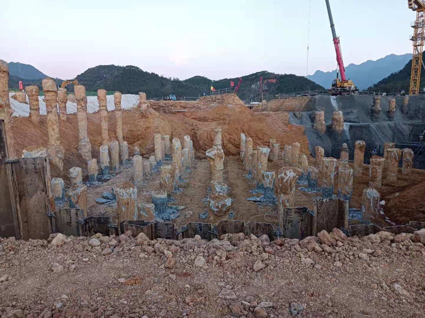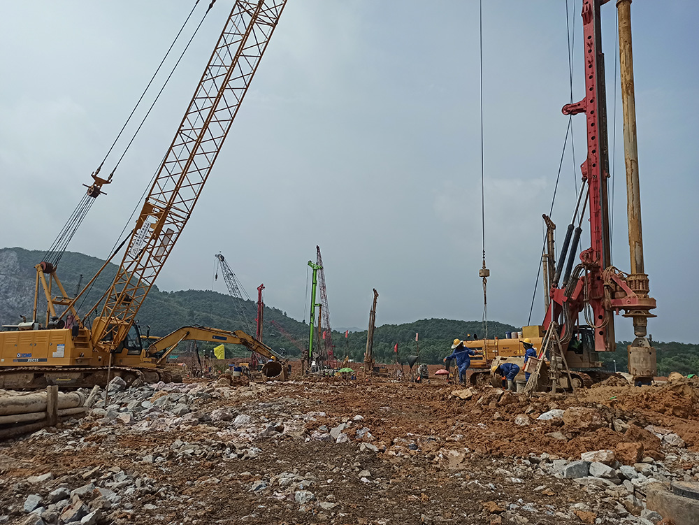 本工程于2021年04月10日開工,2022年01月27日現(xiàn)場(chǎng)樁基施工完工,工程施工期間累計(jì)投入施工人員200余人和大功率旋挖鉆機(jī)10臺(tái)以及相關(guān)匹配的機(jī)械設(shè)備。克服了雨季、高溫和地質(zhì)條件復(fù)雜等諸多不利因素,累計(jì)完成鉆孔灌注樁1857根,處理溶洞約31000m³(含回填片石、水泥、C20砼及注漿和遇溶洞樁超灌混土量)。