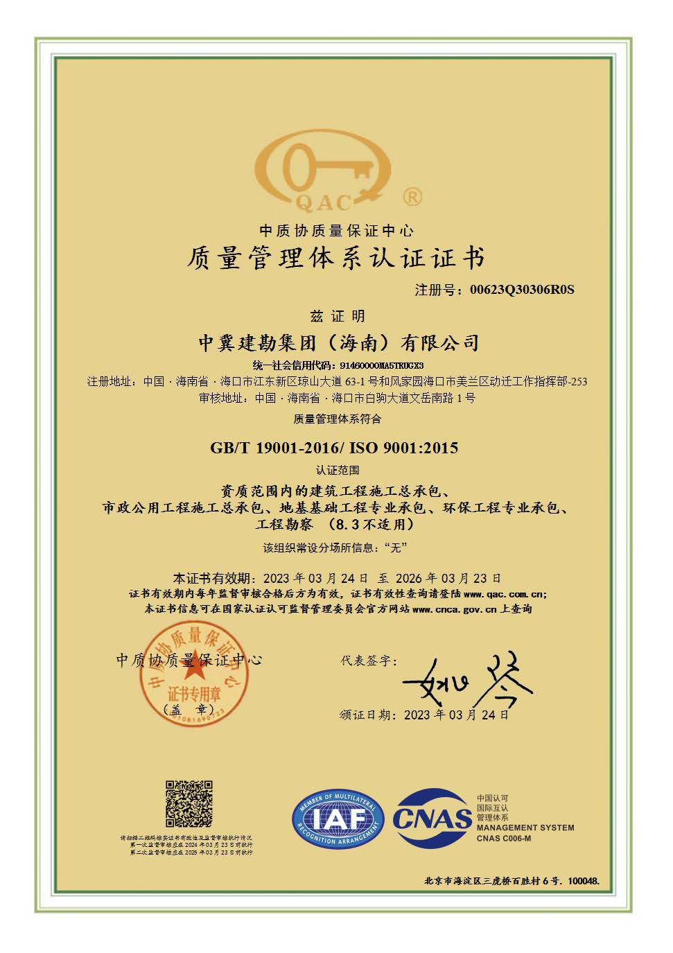 2023年3月13日至18日,經(jīng)認證機構(gòu)現(xiàn)場審核,中冀建勘集團(海南)有限公司順利通過了綜合管理體系的認證,并于3月24日取得了中質(zhì)協(xié)質(zhì)量保證中心頒發(fā)的綜合管理體系認證證書。