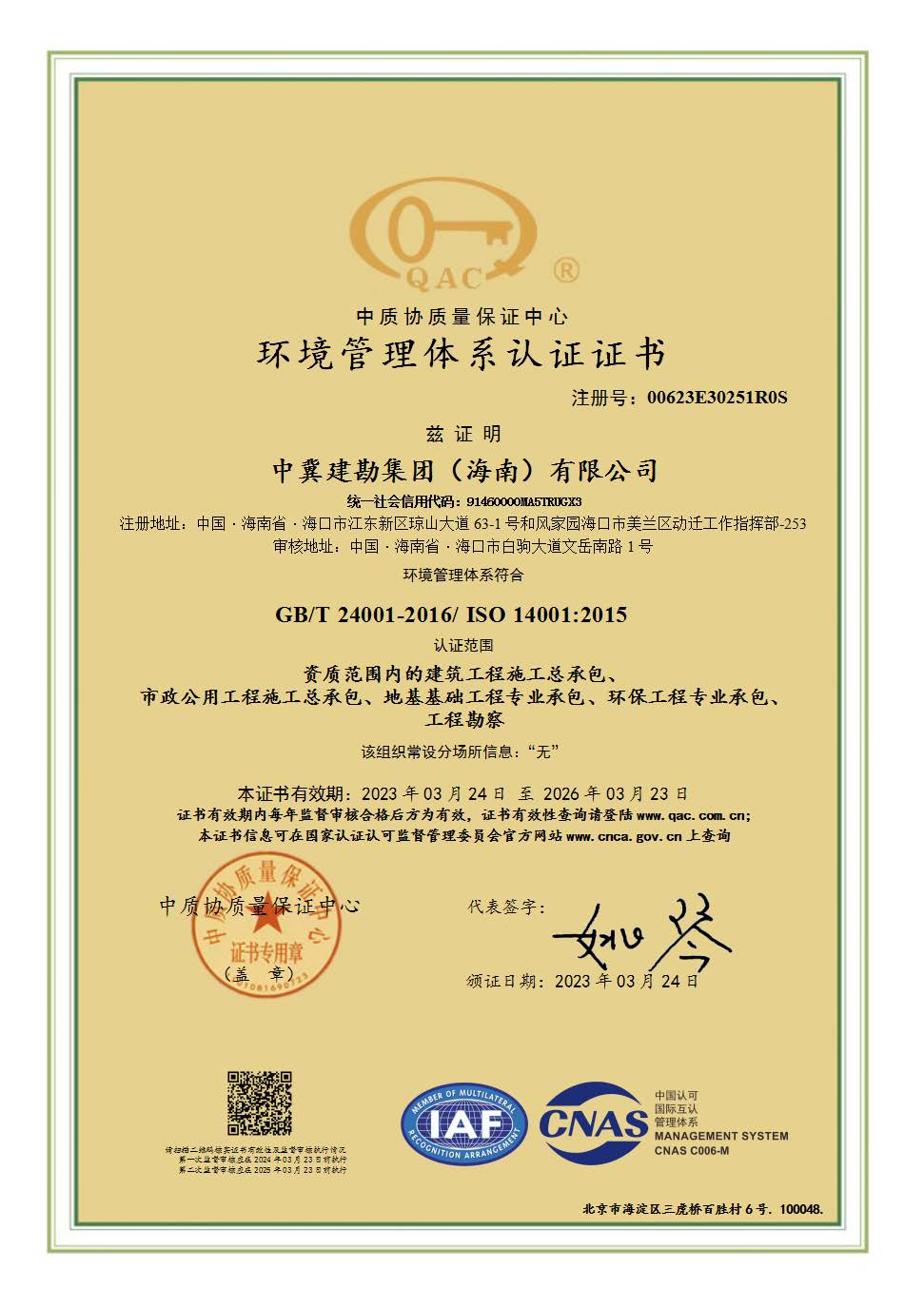 本次認證范圍覆蓋了中冀建勘集團(海南)有限公司現(xiàn)有的建筑工程施工總承包、市政公用工程施工總承包、地基基礎(chǔ)工程專業(yè)承包、環(huán)保工程專業(yè)承包及工程勘察資質(zhì)。這標志著質(zhì)量管理體系(GB/T19001-2016)、環(huán)境管理體系(GB/T24001-2016)、職業(yè)健康安全管理體系(GB/T45001-2020)在中冀建勘集團(海南)有限公司有效貫徹運行。
