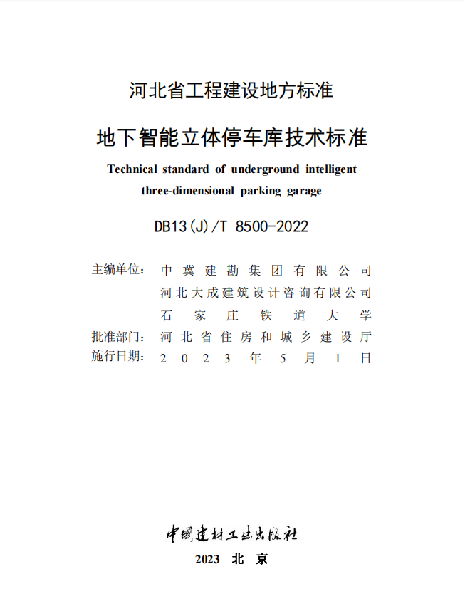 近日,我公司主編的河北省工程建設(shè)地方標準《地下智能立體停車庫技術(shù)標準》(DB13(J)/T 8500-2022)、《污染場地巖土工程勘察技術(shù)標準》(DB13(J)/T 8518-2023)由河北省住房和城鄉(xiāng)建設(shè)廳正式發(fā)布,并印刷出版發(fā)行,分別將自2023年5月1日和7月1日起實施。