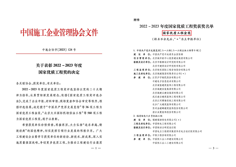 12月9日,中國施工企業(yè)管理協(xié)會發(fā)布了《關(guān)于表彰2022-2023年度國家優(yōu)質(zhì)工程獎的決定》(中施企協(xié)字[2023]124號),我公司參與建設(shè)的3項工程獲得國家優(yōu)質(zhì)工程獎,其中1項工程獲得國家優(yōu)質(zhì)工程金獎。