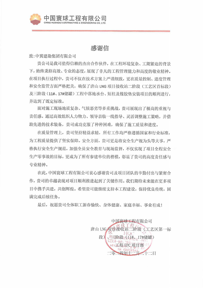 近期,一公司陸續(xù)收到國電電力秦皇島發(fā)電有限公司、中國寰球工程有限公司、中石化寧波工程有限公司、海洋工程股份有限公司、哈爾濱電氣國際工程有限公司等項(xiàng)目發(fā)的來感謝信、表揚(yáng)信以及優(yōu)秀承包商、優(yōu)秀施工單位榮譽(yù)證書。繽紛而至的感謝信及榮譽(yù)證書不僅是對我們過去努力的肯定,更是對未來合作的美好期許,為公司的發(fā)展歷程增添了濃墨重彩的一筆。