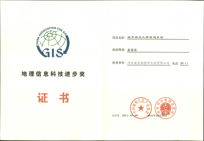 2011年10月25日,2011年度中國地理信息科技進(jìn)步獎(jiǎng)?lì)C獎(jiǎng)儀式在北京國際會(huì)議中心隆重舉行,經(jīng)中國地理信息產(chǎn)業(yè)協(xié)會(huì)、國家測繪地理信息局評(píng)選,我公司完成的項(xiàng)目《城市巖土工程信息系統(tǒng)》榮獲2011年度地理信息科技進(jìn)步三等獎(jiǎng)。