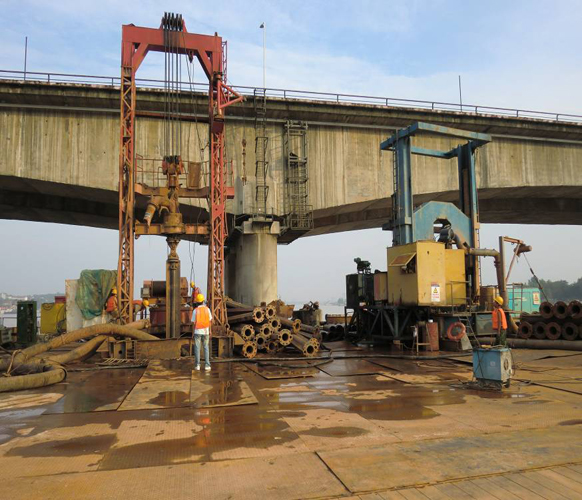 本工程是石長(zhǎng)鐵路的復(fù)線工程,橋址位于湖南省常德市。施工時(shí)間為2010年5月31日至2010年12月31日。采用GF300、ZSD300型回轉(zhuǎn)鉆機(jī)、TR400C旋挖鉆機(jī)及YCJF-250型沖擊反循環(huán)鉆機(jī)成孔,泥漿護(hù)壁工藝。共完成Φ1.8m~Φ2.5m基樁38根,混凝土灌注量8000余方。