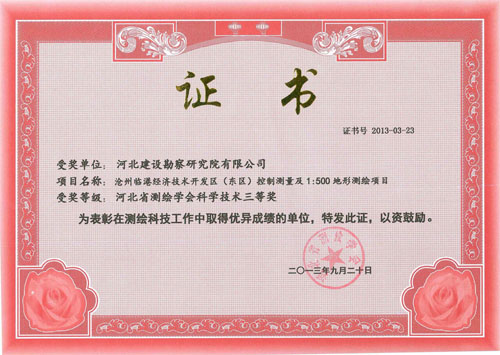 近日,由工程測(cè)量公司完成的滄州臨港經(jīng)濟(jì)技術(shù)開(kāi)發(fā)區(qū)(東區(qū))控制測(cè)量及1:500地形測(cè)繪項(xiàng)目,被河北省測(cè)繪學(xué)會(huì)評(píng)為河北省測(cè)繪學(xué)會(huì)科學(xué)技術(shù)三等獎(jiǎng)。