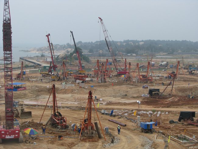 粵東液化天然氣項(xiàng)目由中海油投資建設(shè),CB&I歐洲工程公司承攬三個(gè)儲(chǔ)罐的設(shè)計(jì)、施工、采購(gòu)工作,受美國(guó)CB&I歐洲工程公司委托,我公司承接了三個(gè)罐區(qū)回填砂工作、樁基工程施工和檢測(cè)。自2013年3月7日開始施工,至2013年11月7日竣工,總計(jì)完成回填砂工作量約為7.2萬(wàn)m3,混凝土灌注樁1074根。
